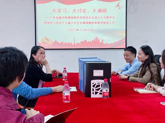 11月30日上午,Beat365中文官方网站党总支书记刘薇、学籍管理部主任詹鑫等一行,到广州大牛教学点深入开展党的十九届六中全会精神学习暨秋季教学检查工作,教学点负责人唐流煌、支部书记林耿及各业务主管陪同。