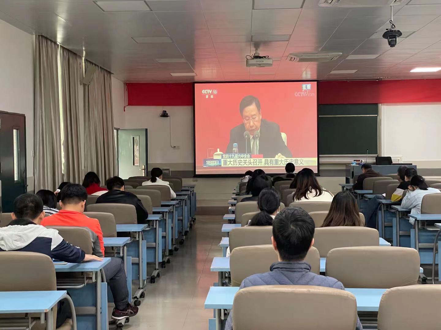 11月12日上午10点,中共中央举行新闻发布会,介绍党的十九届六中全会精神。为深入学习领会党的十九届六中全会精神,Beat365中文官方网站Beat365中文官方网站教工支部组织全体教工党员,在北教B201收看了此次新闻发布会。